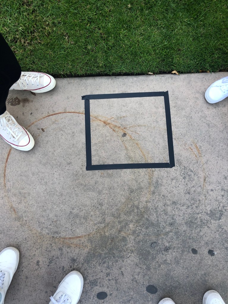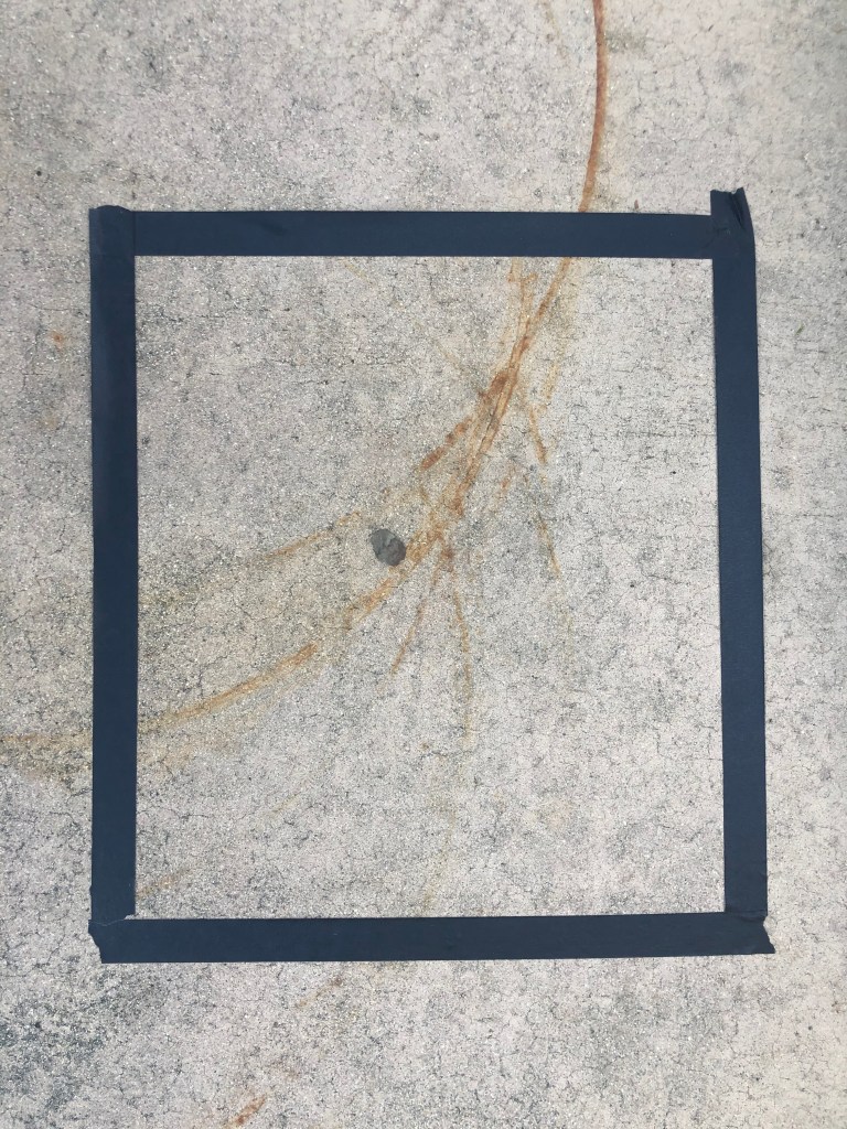 My Art was not Art before I put a rectangle on it because our eyes do not naturally look to see the complexity that was formed by the lines. People tend to look at the overall picture of the big circle of rust and look to the trashcan on the side to make a connection, ultimately forgetting they had even thought about it. But, after using the tape to focus in on the intense parts of the rust, it is much clearer to make a connection towards why this is Art.
